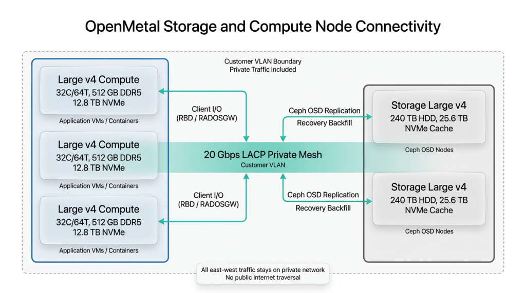 Storage servers connect to compute nodes over the same 20 Gbps LACP-bonded private mesh that links all OpenMetal bare metal servers, using customer-specific VLANs with all private traffic included at no additional cost.