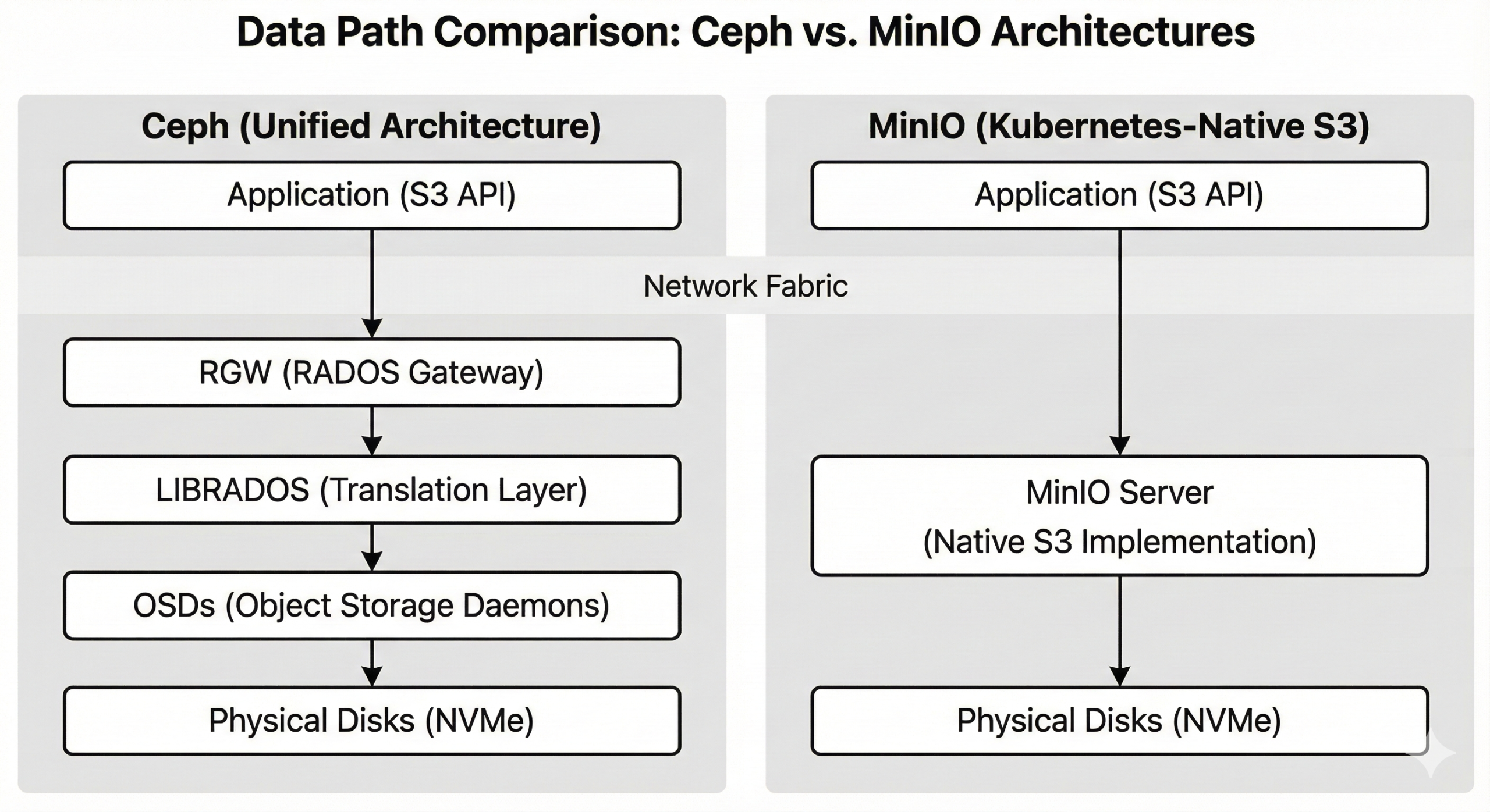 When your infrastructure only requires object storage (no block or file storage), MinIO’s focused design provides a more efficient and performant solution than Ceph.