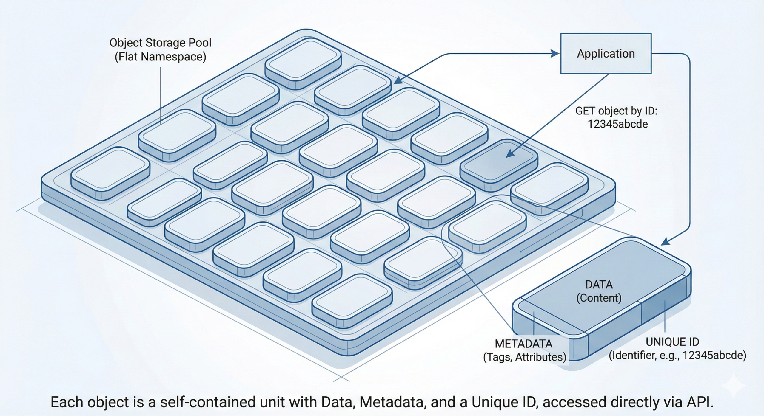 Object storage works differently than traditional file or block storage. Instead of organizing data in hierarchical directories or fixed-size blocks, it manages data as discrete objects. Each object includes the data itself, custom metadata, and a unique identifier. This approach enables massive scalability and works particularly well for cloud-native applications, backup systems, media repositories, and data lakes.