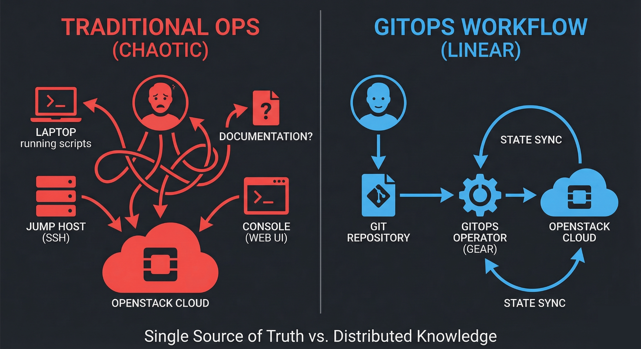 There’s a better way. GitOps workflows that revolutionized Kubernetes operations work just as well for OpenStack infrastructure. The difference is significant: instead of SSH-ing into jump hosts to run Terraform manually or hoping your CI/CD pipeline catches errors before they hit production, your infrastructure changes flow through Git with the same review, approval, and automation processes your development team already uses.