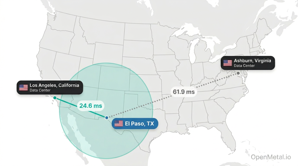 The average ping from El Paso to OpenMetal’s nearest data center in Los Angeles is 19.627 ms (24.627 ms adjusted for last-mile overhead). A secondary facility in Ashburn averages 61.93 ms adjusted. These measurements were taken in March 2026.