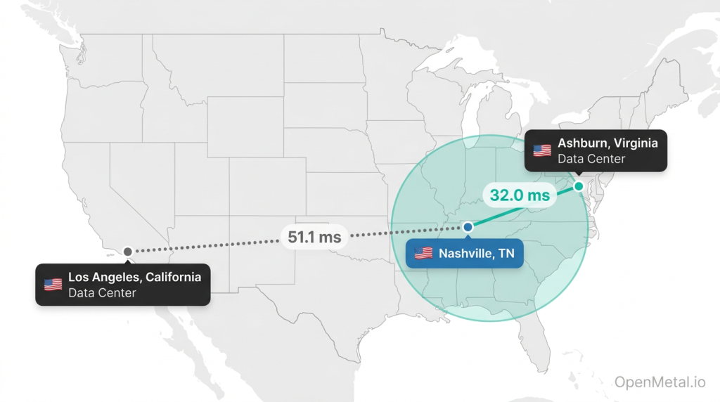 OpenMetal’s Ashburn data center delivers dedicated, compliance-ready infrastructure to Nashville at 32.0 ms, meeting the performance and regulatory needs of the city’s healthcare and technology sectors.