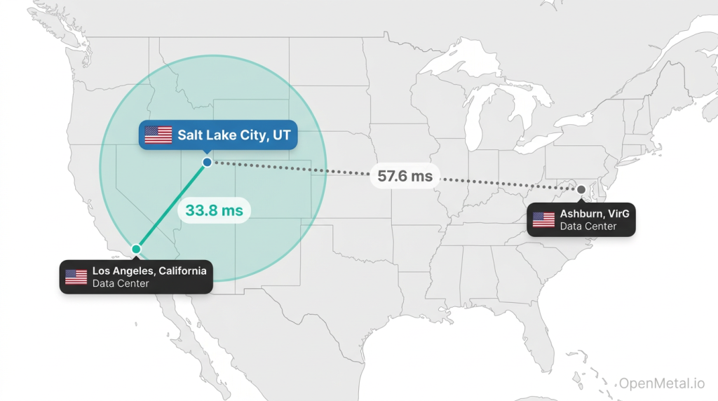 The average ping from Salt Lake City to OpenMetal’s nearest data center in Los Angeles is 28.822 ms (33.822 ms adjusted for last-mile overhead). A secondary facility in Ashburn averages 57.612 ms adjusted. These measurements were taken in March 2026.